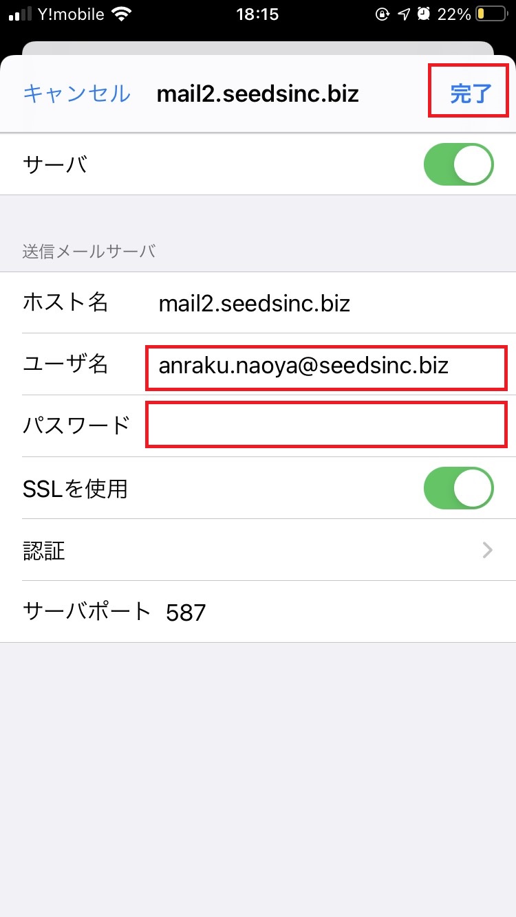 - 送信メールサーバの「ユーザ名],「パスワード」を入力し、右上の「完了」をタップします。※設定情報、パスワードはこちら。