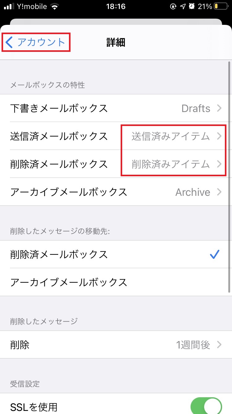 - 「送信済メールボックス」,「削除済メールボックス」が設定されているのを確認し、左上の「アカウント」をタップします。